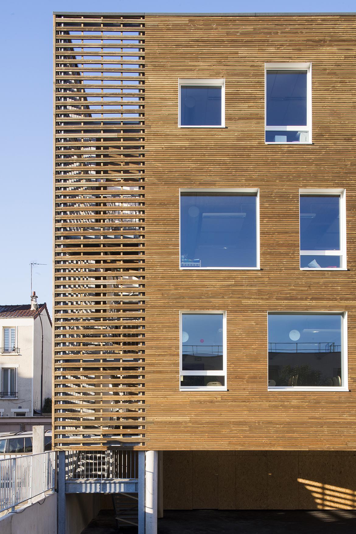 L’ensemble s’inscrit dans une volumétrie cubique que seuls 2 évènements viennent creuser : le hall d’entrée coloré et le préau en matériaux bruts. Les espaces techniques (entrée logistique / escalier de secours) sont masqués derrière un bardage à claire-voie. La technique se donne à lire : les sous-faces des planchers bois, les poutres, les gaines de ventilation tout comme les chemins de câbles sont apparents.