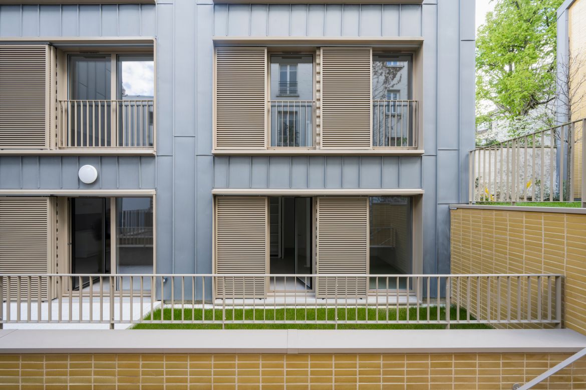 Depuis plus de 10 ans, HABITAT SOCIAL FRANCAIS (HSF), Entreprise Sociale pour l’Habitat et filiale de la RIVP, a pour spécificité de vouloir accompagner ses opérations de réhabilitation PLAN CLIMAT par un questionnement sur la capacité des sites à accueillir de nouveaux logements. Après avoir réhabilité un ensemble de 50 logements à l’angle des rues Pavillons/Chevaliers à Paris (pointillé ci-dessous), HSF désigne l’agence PRINVAULT ARCHITECTES pour construire 13 logements sociaux locatifs en cœur d’îlot. Cette opération comprend la démolition d’une maison en ruine, la restructuration de bâtis existants et la construction de deux nouveaux bâtiments en structure bois. Il s’agit d’une opération complexe de couture urbaine qui a nécessité l’implantation de 48 micropieux sur 16m de profondeur et le coulage de 3 niveaux de voiles par passes contre des constructions existantes fragilisées par le temps. L’impossibilité d’implanter une grue à tour a imposé l’excavation de 1.000m3 de terre au Bobcat et l’approvisionnement du chantier au travers la porte du parking existant. Le projet est en structure bois SuteKi-Wood, système constructif 1D développé par Ki-Wood, inspiré de la tradition japonaise. Les poteaux-poutres manuportables en bois lamellé-collé conçus hors-site s’assemblent sur le chantier comme un jeu de Légo grâce à des connecteurs sans vis. L’isolant posé dans l’épaisseur de l’ossature est constitué de fibres de chanvre, de coton et de lin. Pour inscrire ces bâtiments neufs dans leur contexte urbain, l’agence s’est inspirée de l’esthétique des ateliers de fond de cour typiques des îlots faubouriens. Nous avons opté pour des toitures en pente, des façades en zinc rythmées par de grands ensembles de menuiseries dotés de volets coulissants et un traitement spécifique des pignons en brique de terre cuite émaillée. Les jardins descendent en terrasse les pentes de la colline de Belleville, alternant les ambiances et participent à créer une véritable promenade architecturale en cœur d’’îlot.