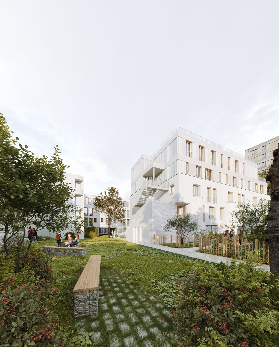 Ce projet de 92 logements situé au 10, cour Métairie à Paris 20e comprend 2 volets : la réhabilitation de 81 logements existants et la construction de 11 logements sur les toits. Habitat Social Français (Groupe RIVP) a souhaité accompagner la transformation de ce patrimoine en questionnant la capacité du site à accueillir de nouveaux logements sur les toits tout en inscrivant l’ensemble dans une démarche environnementale forte (Construction bois + Matériaux biosourcés + Réemploi). Notre projet s’inscrit dans la modernité blanche dont est issue l’esthétique des bâtiments existants. Une même couleur, le blanc, est choisie pour traiter l’existant comme la surélévation, déclinée en différents matériaux (enduit blanc + pâte de verre blanche + bardage métallique blanc). Le projet comprend également le réaménagement d’espaces extérieurs collectifs, le remplacement des revêtements de sol extérieurs, la réfection des jardins privatifs (plantes locales, nouveau mobilier de jardin, remplacement des clôtures) et l’implantation d’une zone de rétention de pluie.